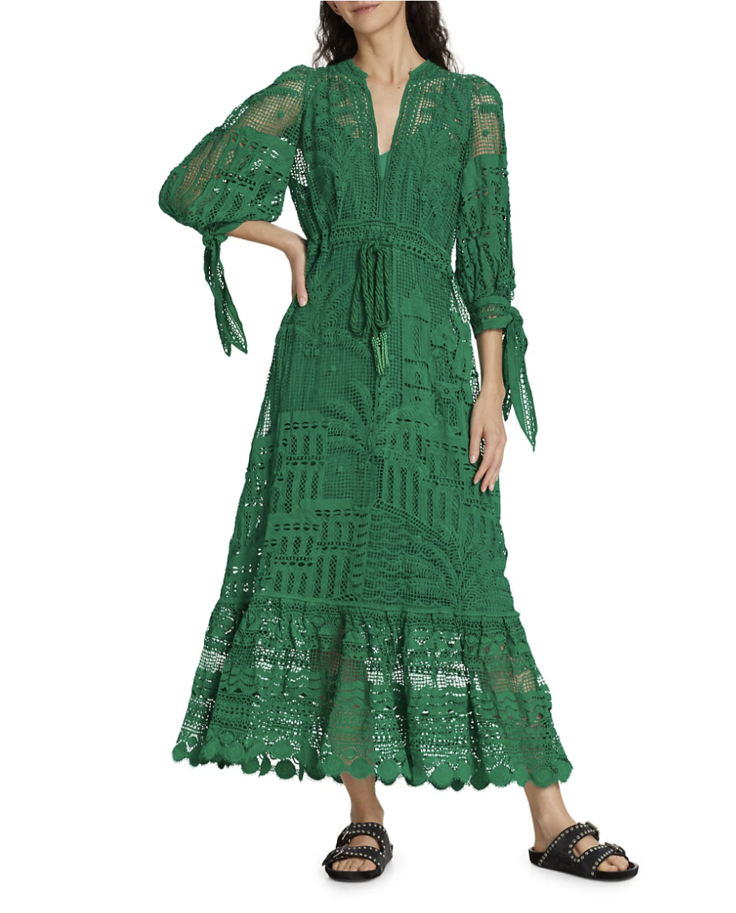 Farm Rio's Morada Boa dress spotlights an intricate mixed guipure lace design and a beaded tassel drawstring waist. This midi-length piece is finished with a single-tiered skirt and knotted cuffs.